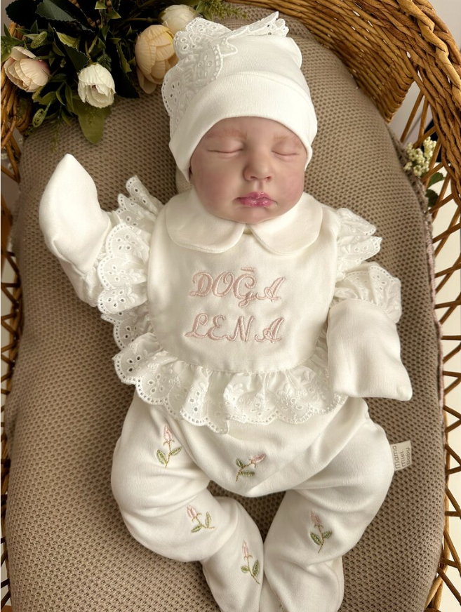 Our scalloped jumpsuit, which can be written with two names, includes gloves and is sold with a hat.