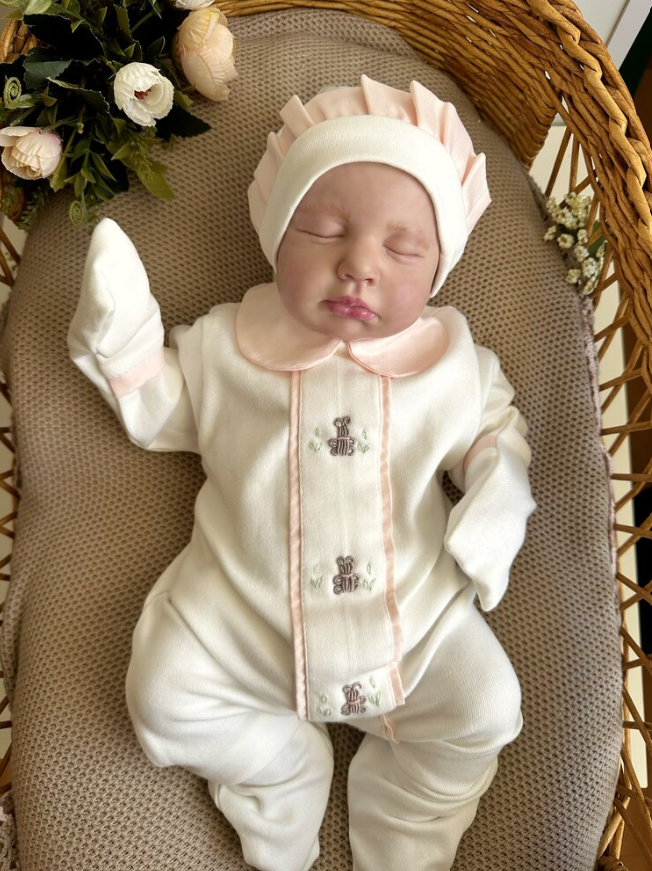 Our set, consisting of overalls, hat, blanket and pillow, is made of 100% combed cotton, all of which are our own production and design.