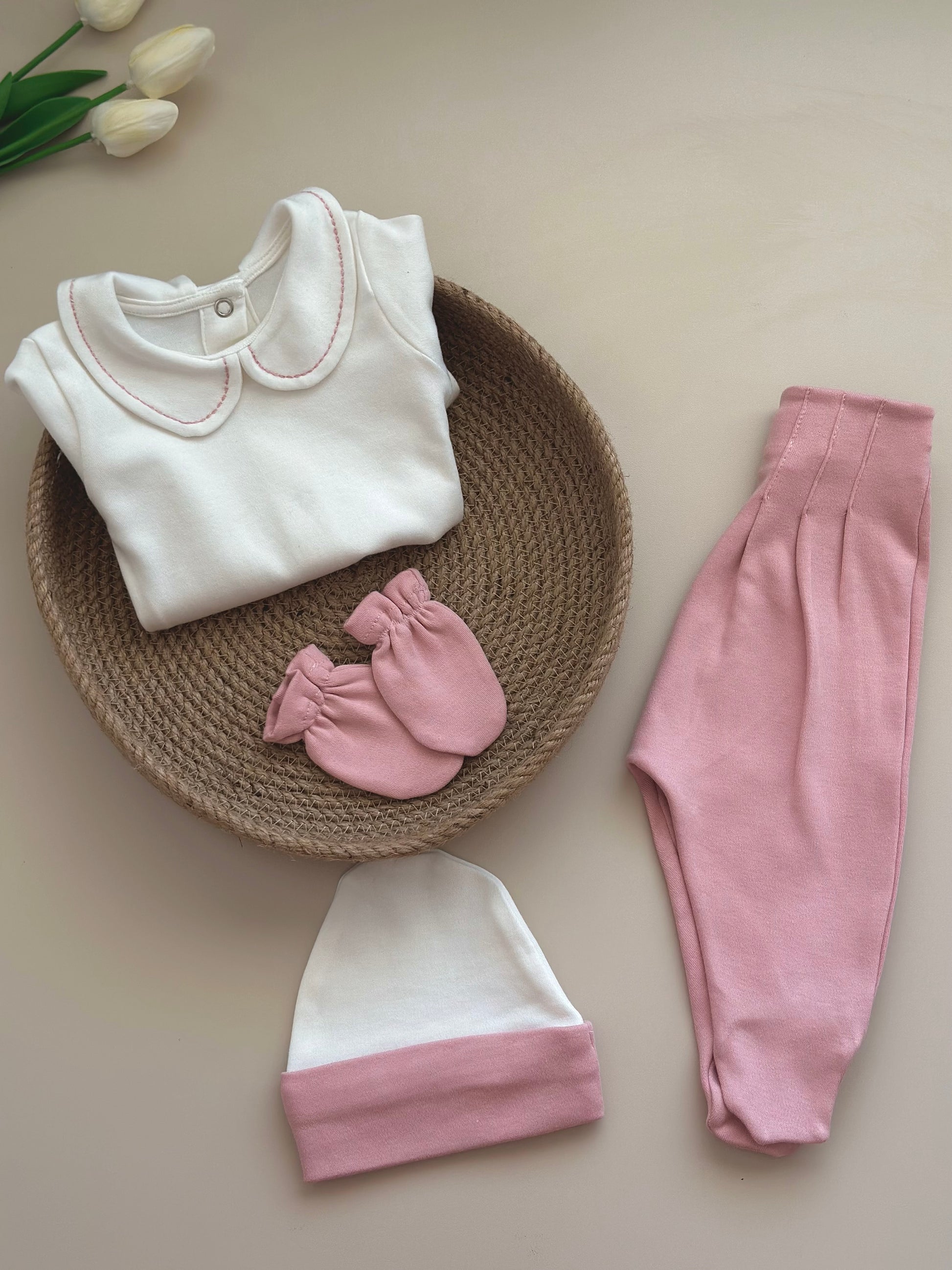 Our set includes basic pieces; trousers with booties, bodysuit, hat and gloves.