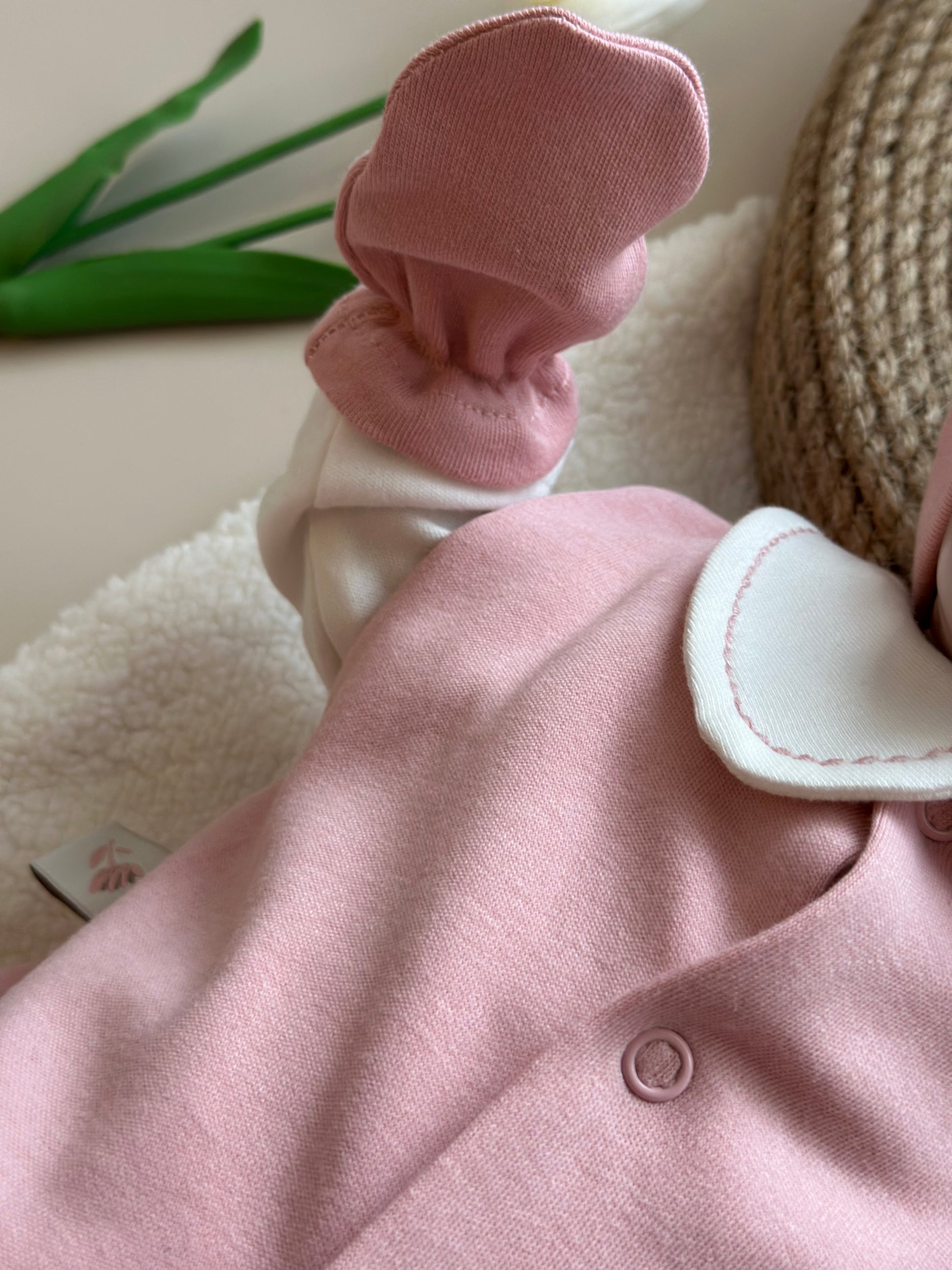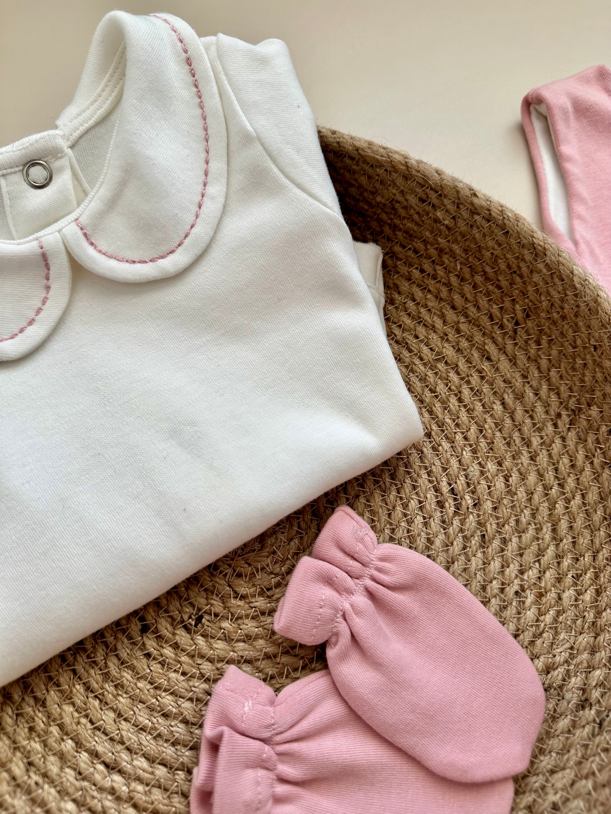Our set, made of soft, colorful and OEKO-TEX certified 100% cotton combed cotton, includes a vest suitable for both hospital discharge and daily use, a bodysuit with snaps on the back and between the legs, pleated trousers, a beret and gloves.