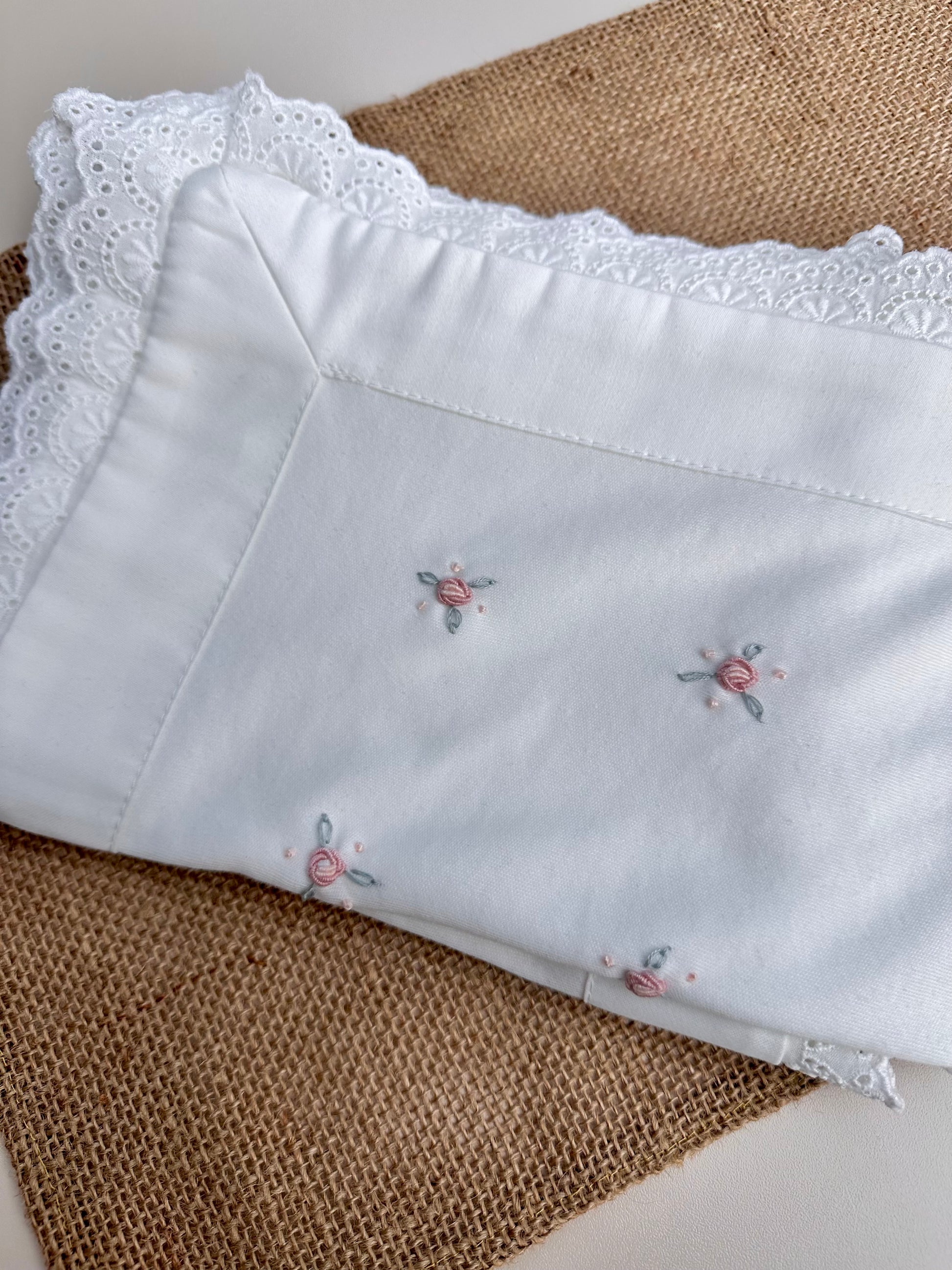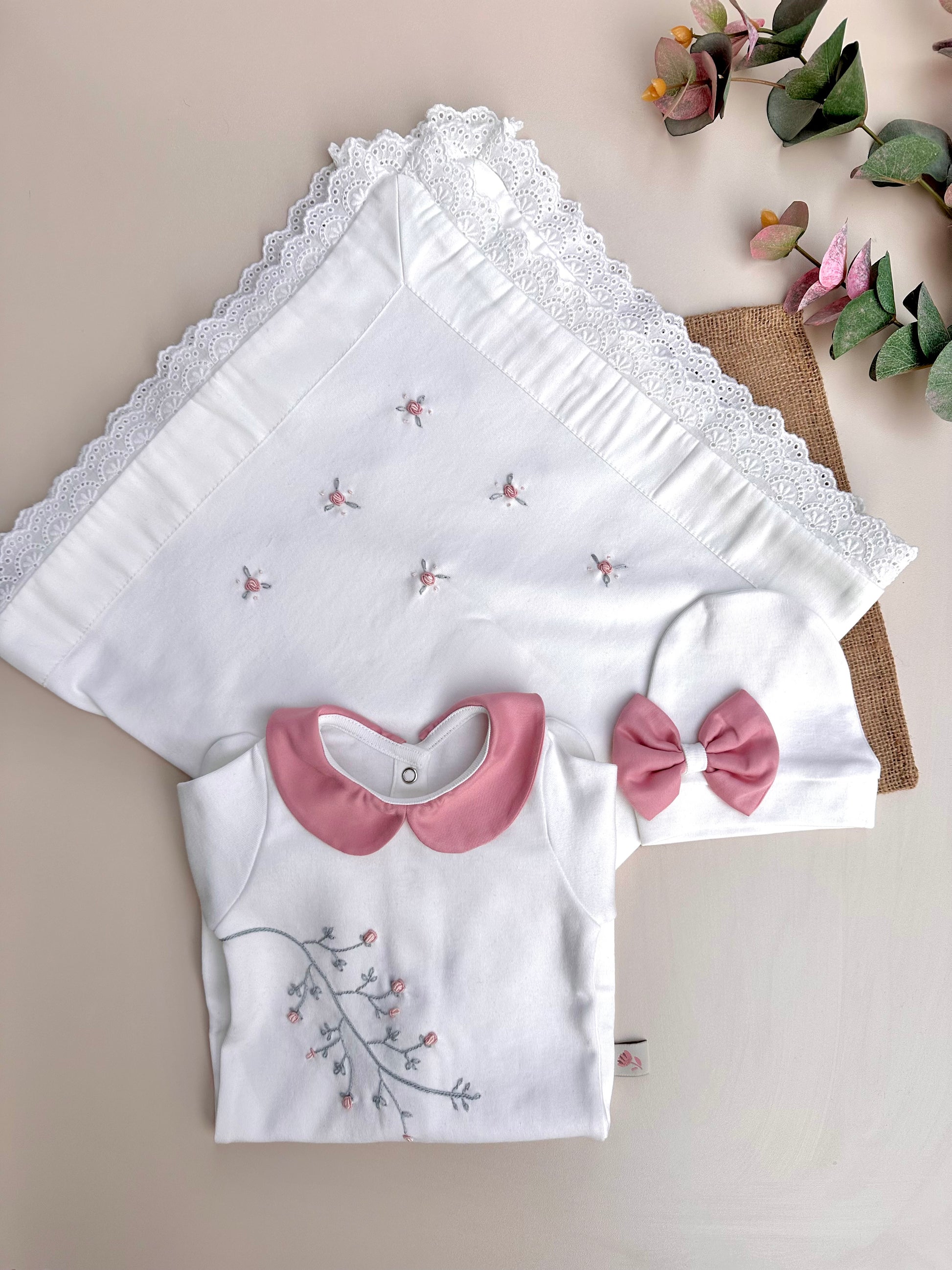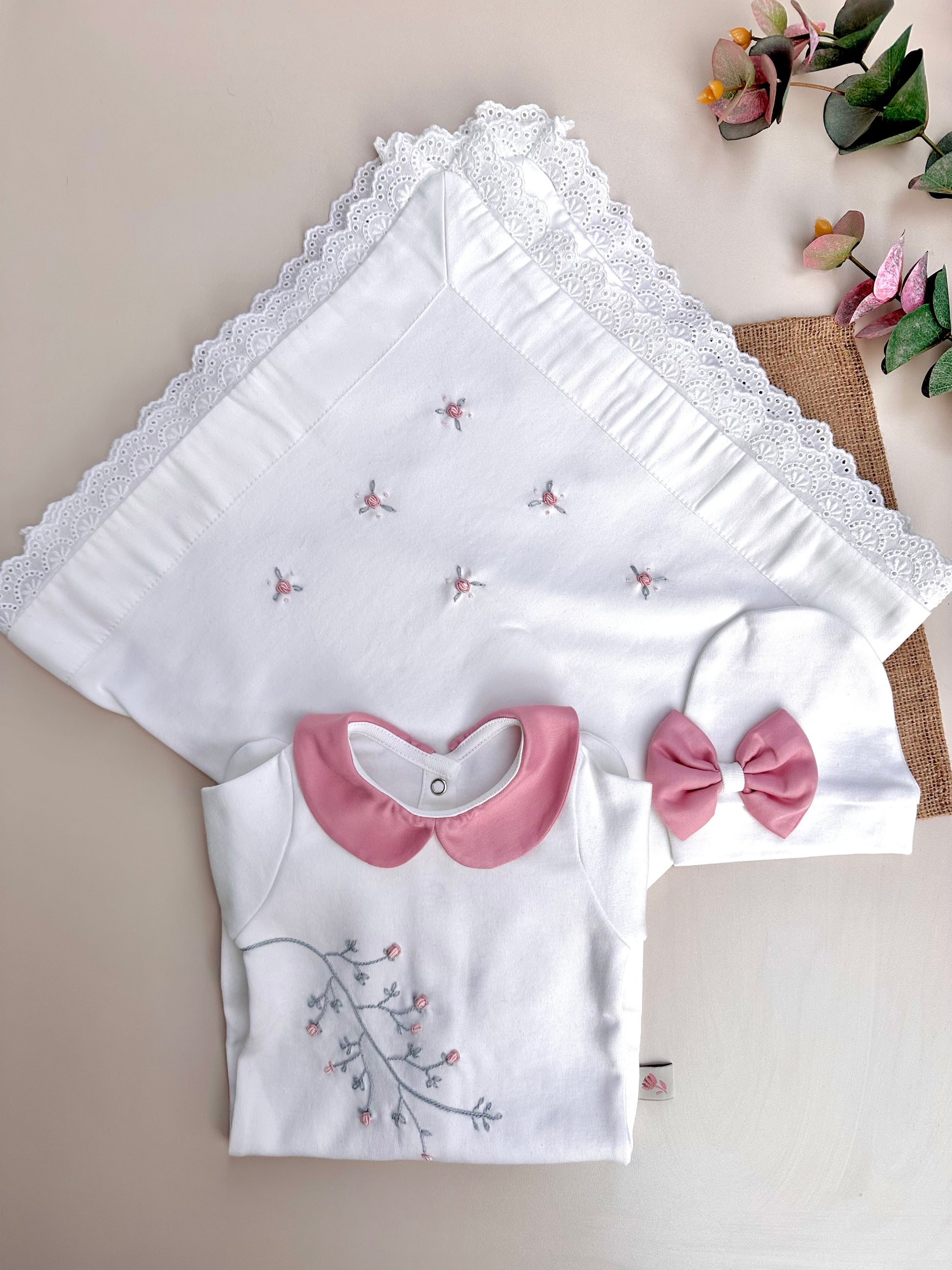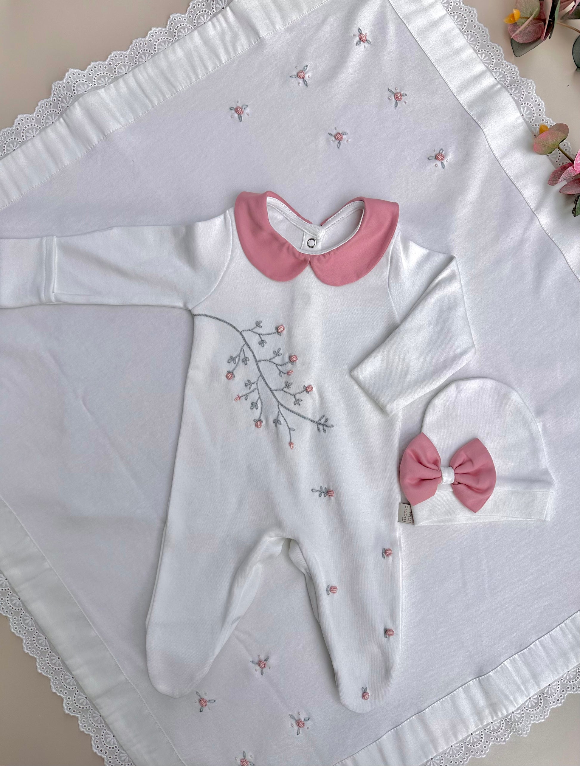 Pembe Dal Çiçekli tulum ve şapkamız, yanında 80x80 cm ölçülü, iki köşesi el işi çiçeklerle süslenmiş tek katlı, fistolu battaniyemiz set halinde satılmaktadır