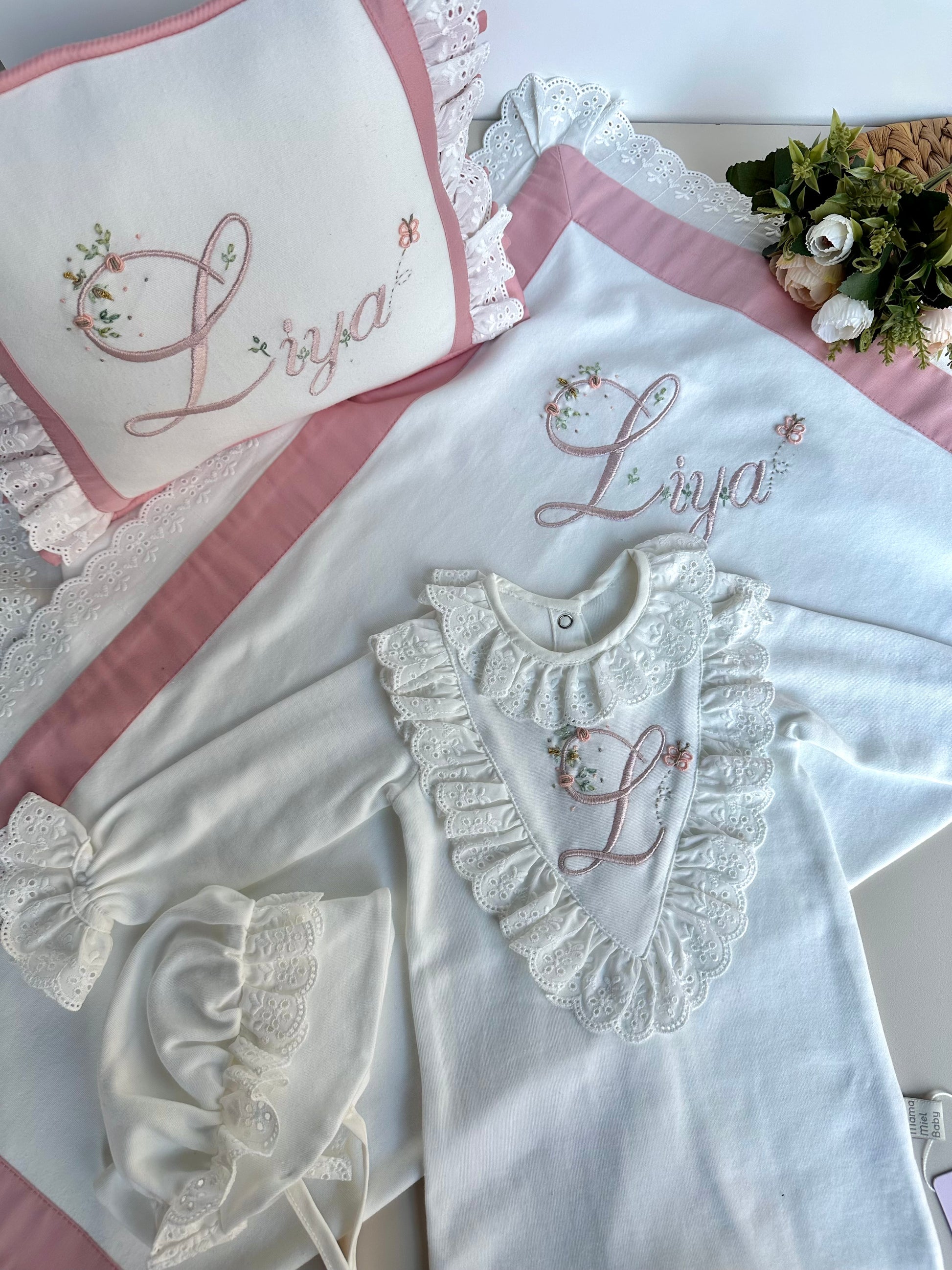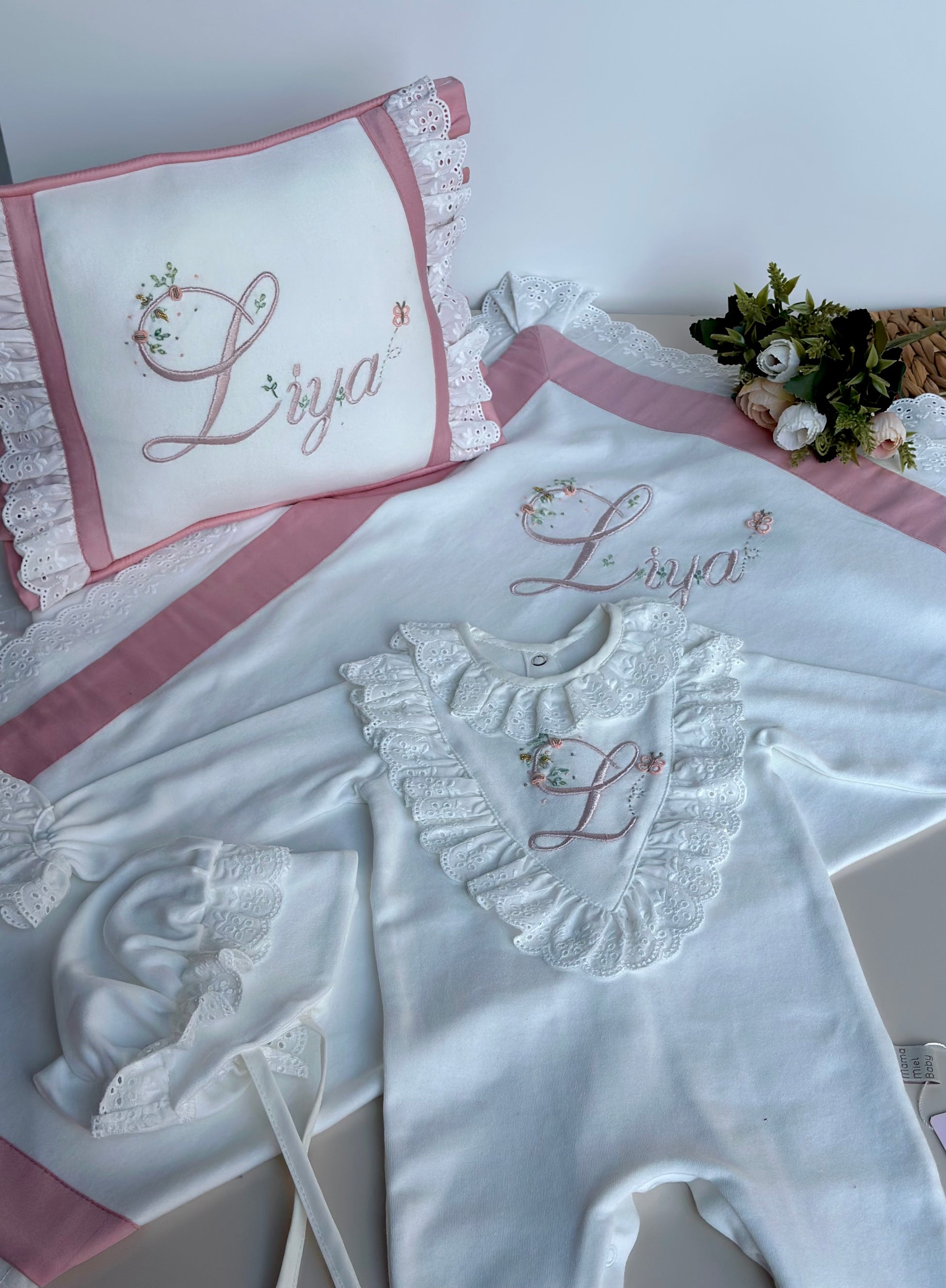 Setin içinde tulum, şapka fisto ve pamuk saten detaylı yastık ve battaniye bulunmaktadır