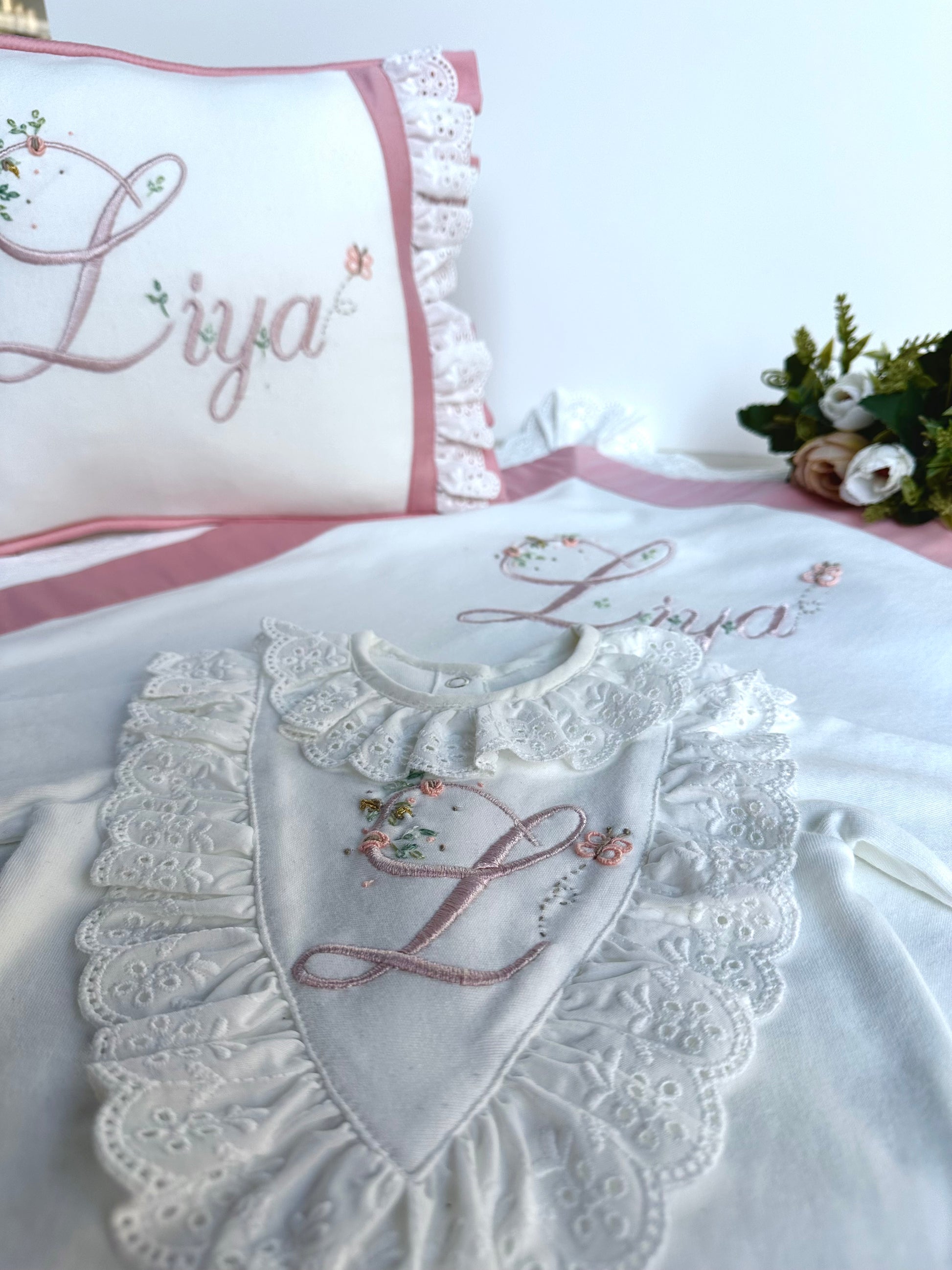 Baş harf detaylı tulumumuzun üstü el işi çiçekler ve kelebeklerle süslüdür