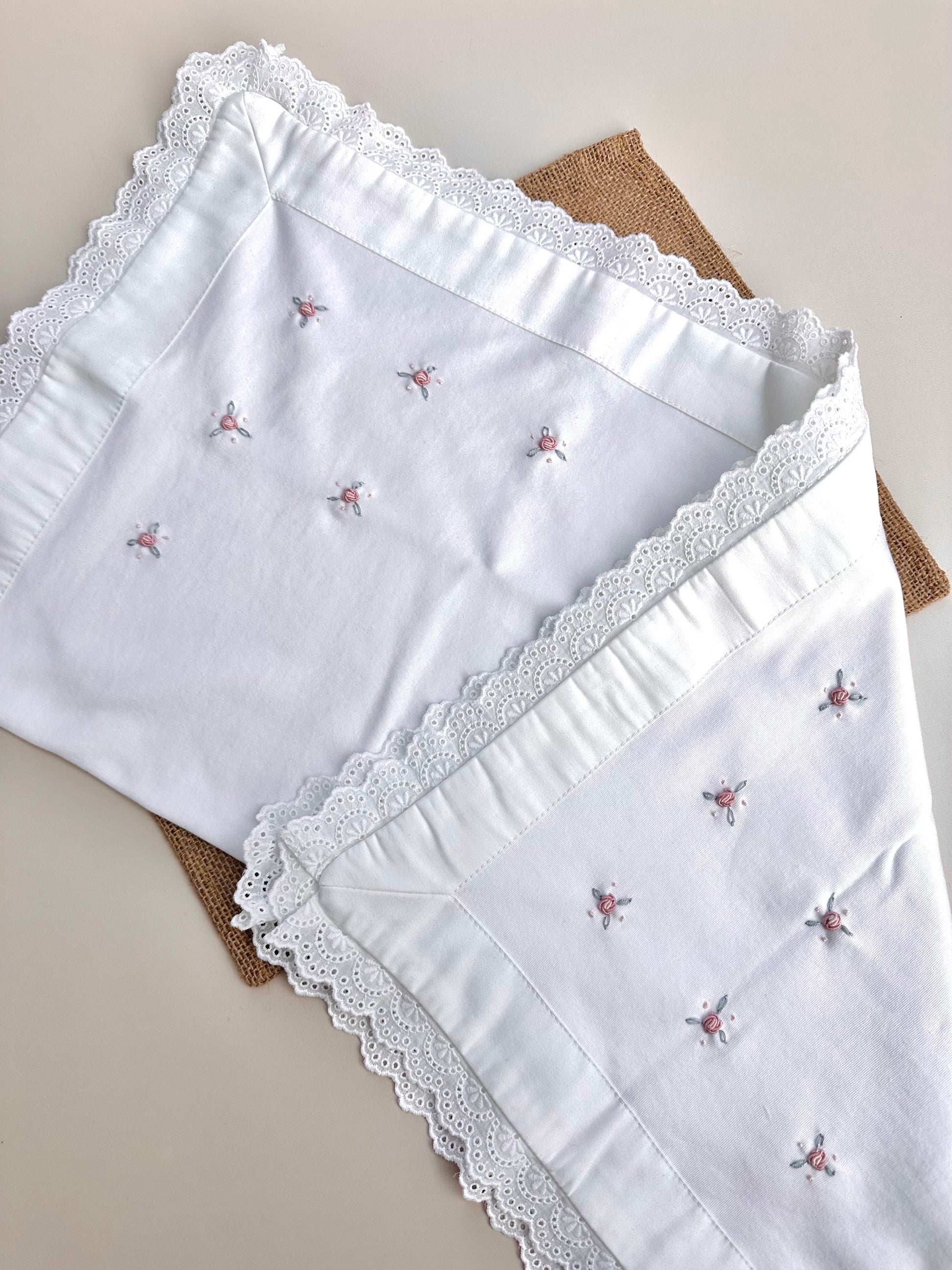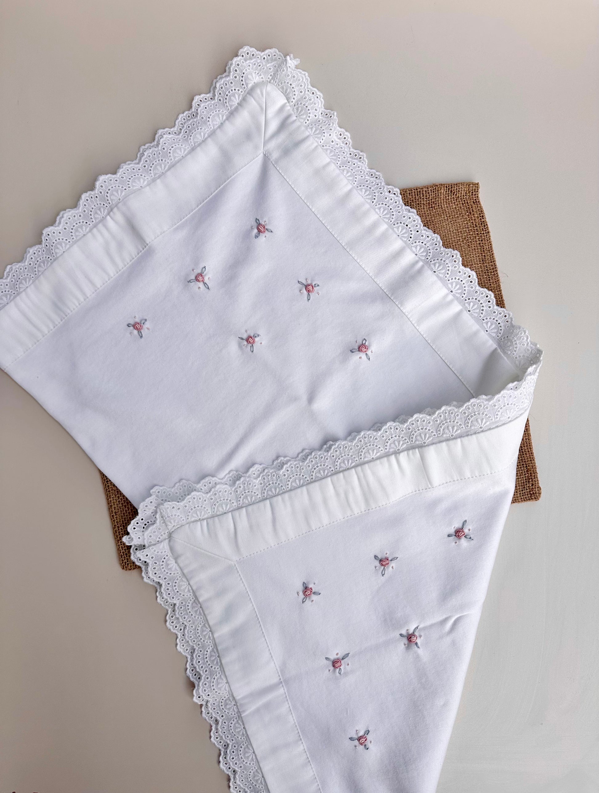 80x80 cm ölçülü, iki köşesi el işi çiçeklerle süslenmiş tek katlı, fistolu battaniyemiz