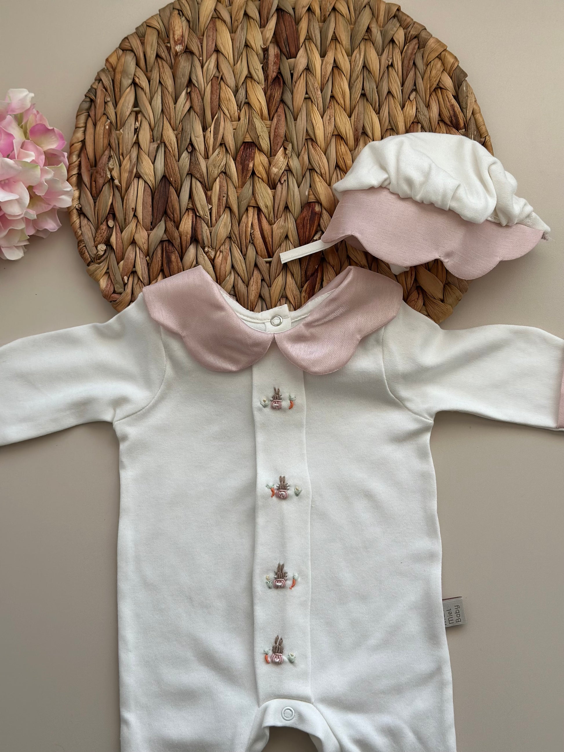 Our overalls are sold with its hat, the carrots and rabbits are hand embroidered, the hat is not hand embroidered.