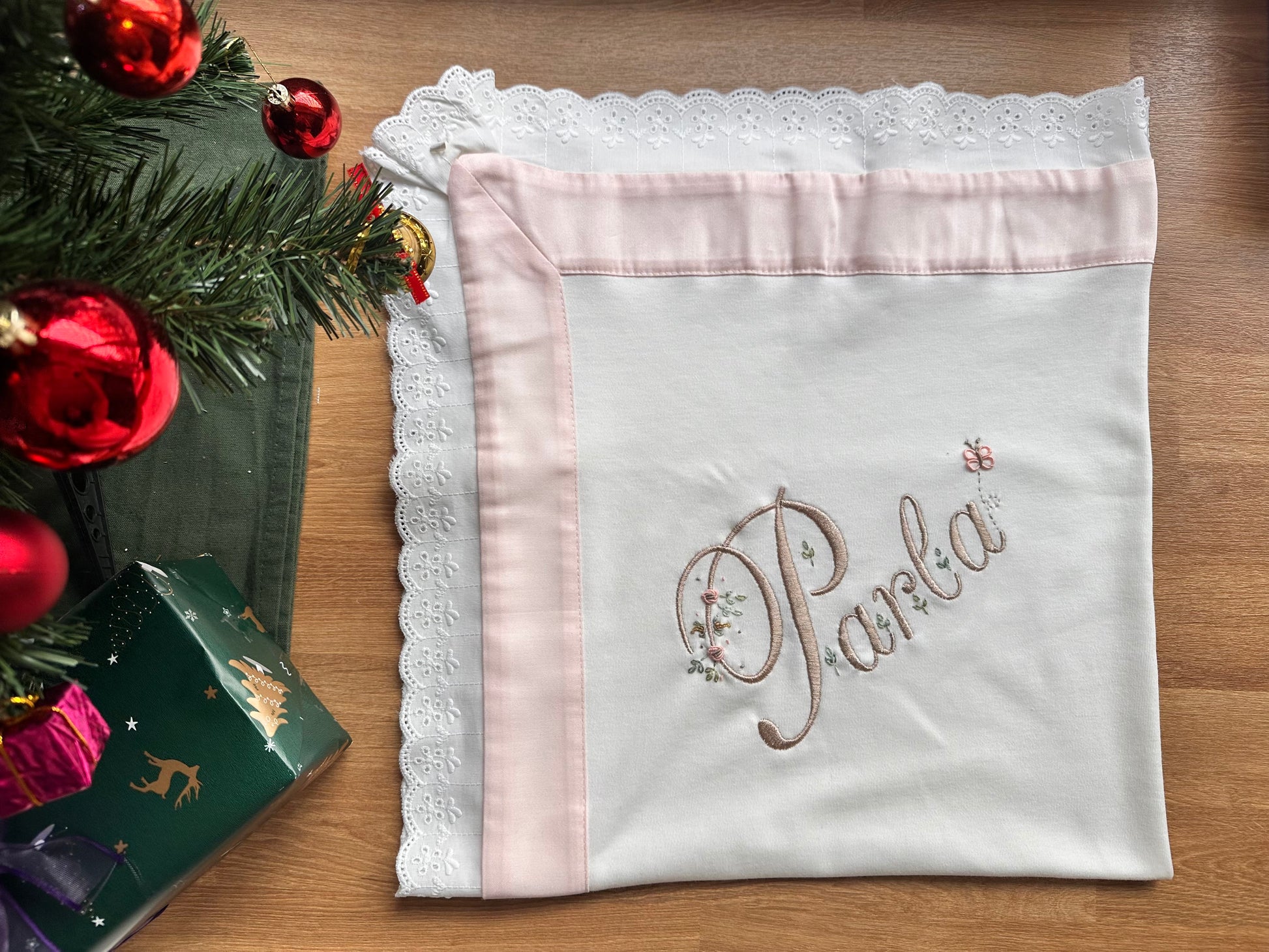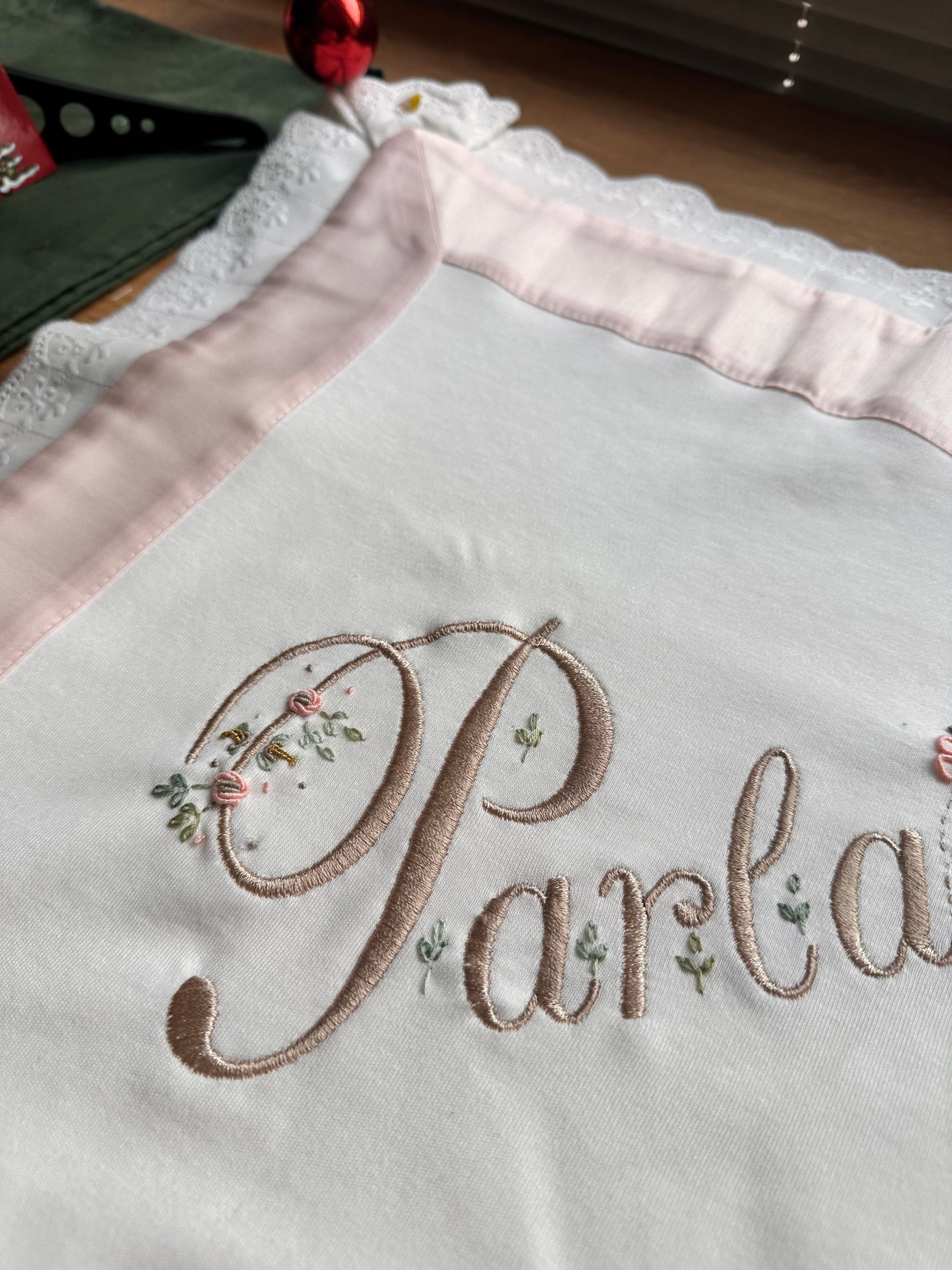 Sadece tek köşe kısmında isim ve el nakışı bulunmaktadır