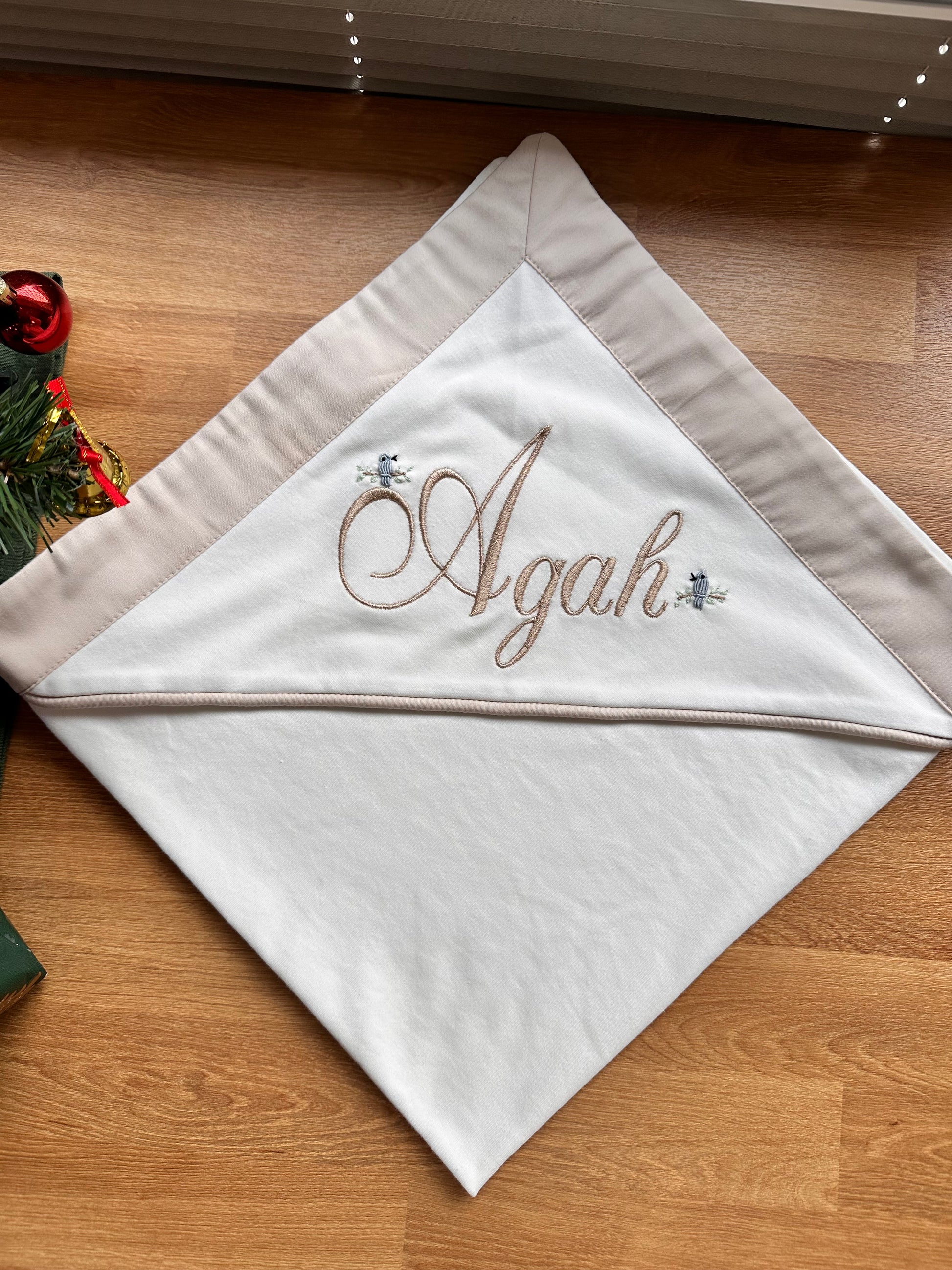 Sütlü kahve kuşlu battaniyemizin kenarları sütlü kahve pamuk satendir, mavi kuşlar el işlemesidir ve 80x80 cm ölçüde tek katlı battaniyedir