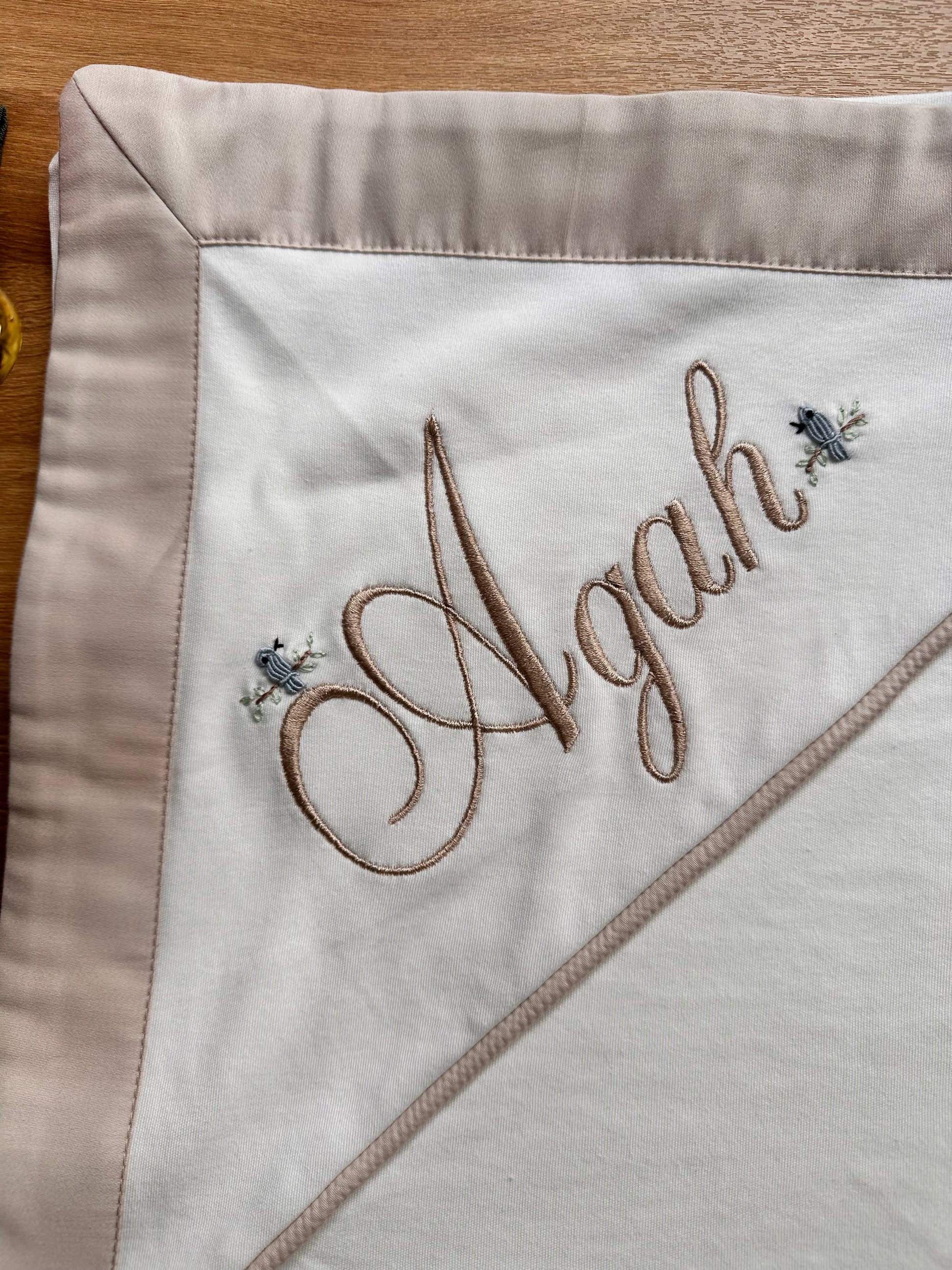 Sadece tek köşe kısmında isim ve el nakışı bulunmaktadır