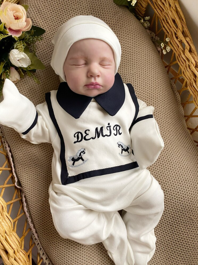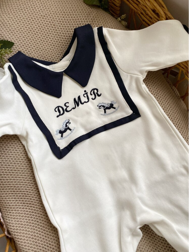 Önlük detaylı makine nakışlı atlı önlüklü tulumumuz düz bere şapkası ile beraber satılmaktadır. Bebek üstünde önlük göbek kısmına kadar inmektedir ancak giyilmemiş halinde önlük daha yukarıda durmaktadır bu detayı dikkate alınız